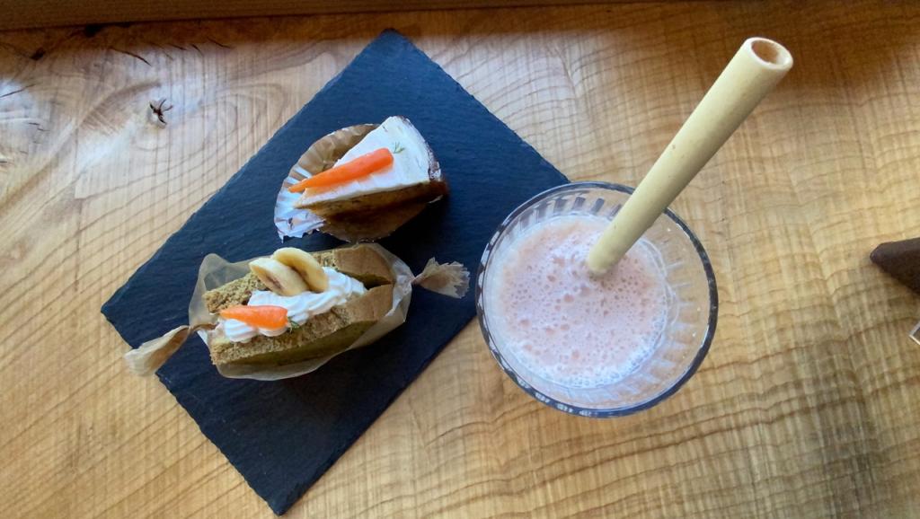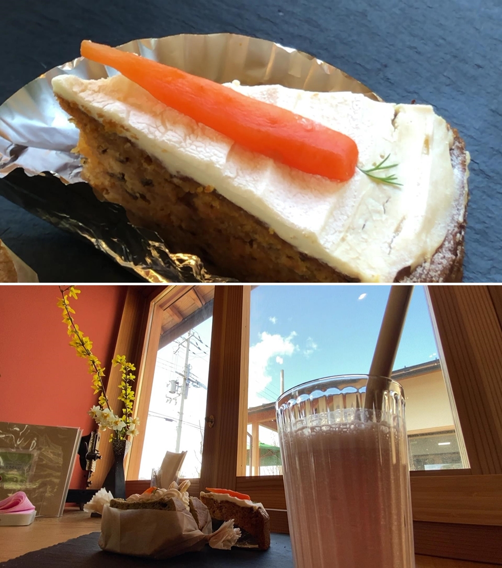 人気のケーキ「ビオ・ラビッツ・キャロット」と「自分で選ぶオリジナル野菜スムージー」を注文。