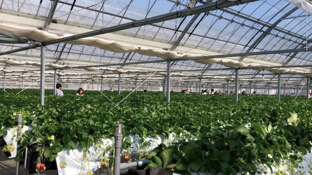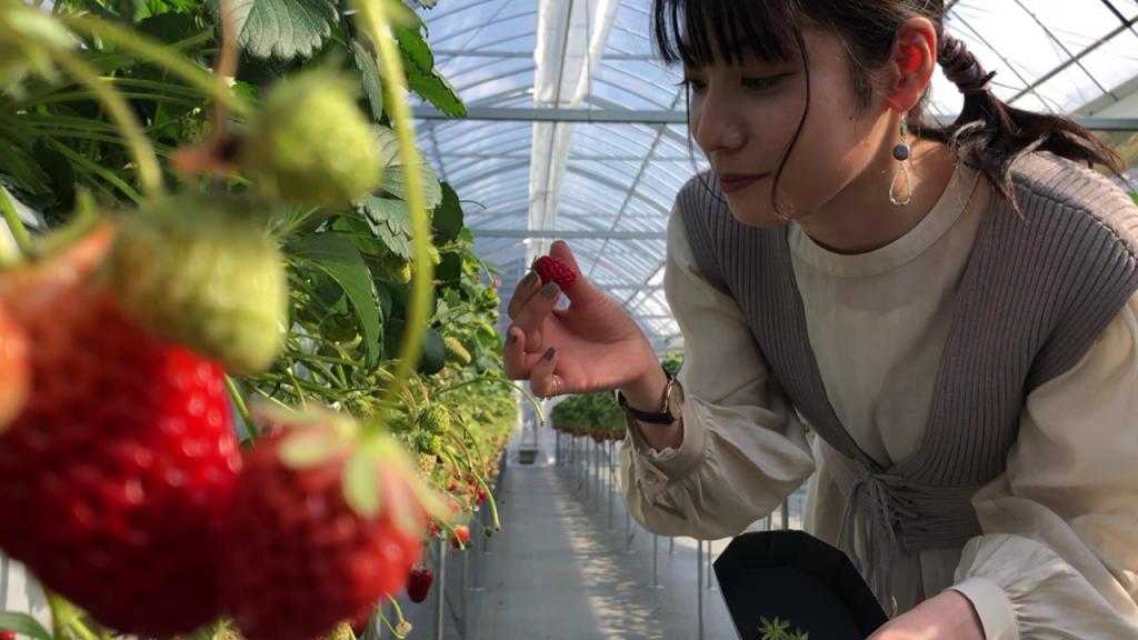 「ストロベリーフィールズ」と名付けられたハウスに入ると、イチゴの新鮮で甘い香りで包まれます。7棟合計2,142㎡の広さ。