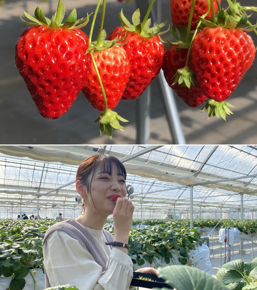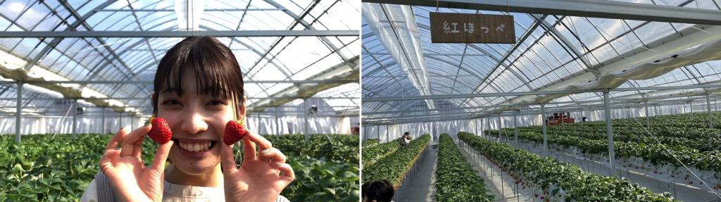 最初に食べたのは「紅ほっぺ」という種類。実が大きくいちご本来の甘さと酸味が特徴です。ほかにも上品な香りとさっぱりした甘さの「かおり野」。酸味が少なくまろやかな甘味の「章姫」。甘味・酸味・風味が四つ星の「よつぼし」が40分間食べ放題なんです。