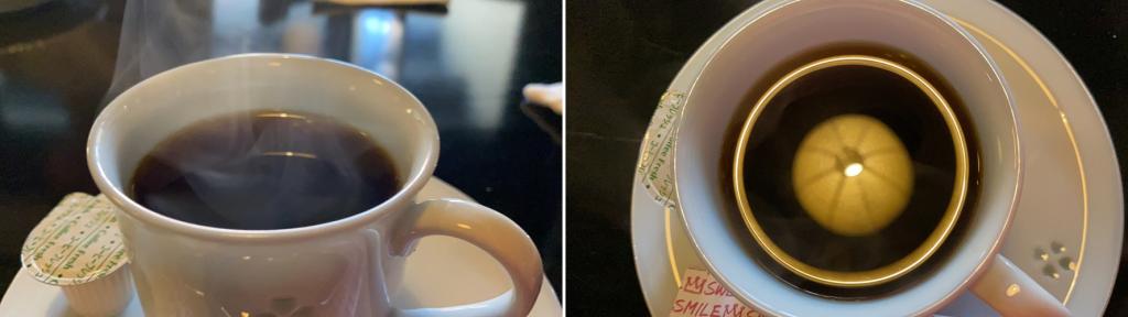 こだわりコーヒーを飲んでほっと一息。・・・静かな時間がながれます。天井からつるされている和風の照明がコーヒーに映りこみ、素敵な感覚になります。