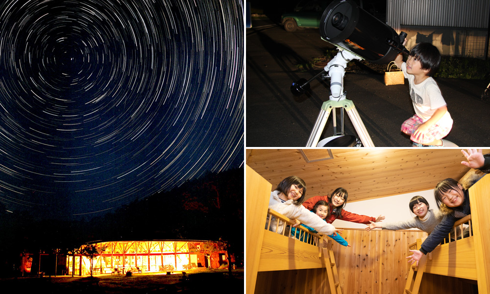森の中にひっそりとたたずむ宿泊施設もあります。テレビもラジオもありません。 耳をすませば、虫や動物の鳴き声が聞こえてきたり、空を見上げれば、満天の星が望められたり… ※天体望遠鏡はご宿泊者のみご利用頂けます。