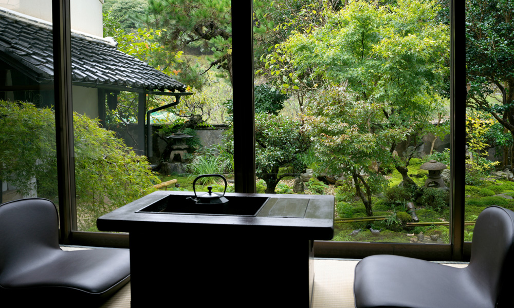 歴史ある商家の風格と苔生す日本庭園の美しさ。囲炉裏端でいただく四季折々の幸。