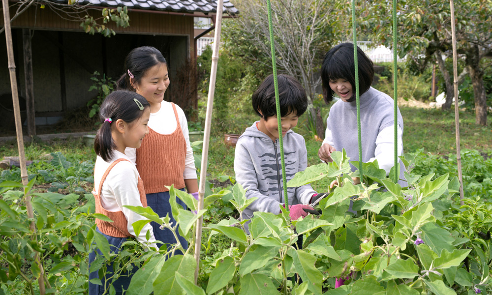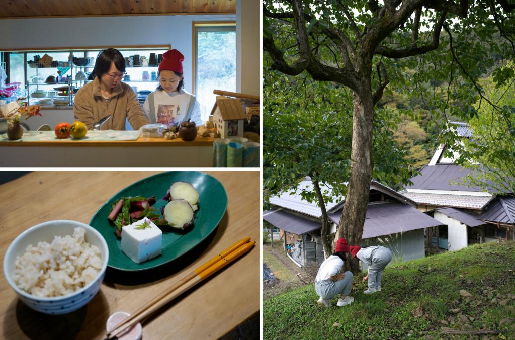 宿では一緒に料理を作ったり、ちゃぶ台を囲んで団らんしたり。オーナー家族も交え、泊まり客同士が一期一会のかけがえのない時間を過ごします。敷地内にある畑で一緒に収穫した野菜がそのまま食卓に上ることも。