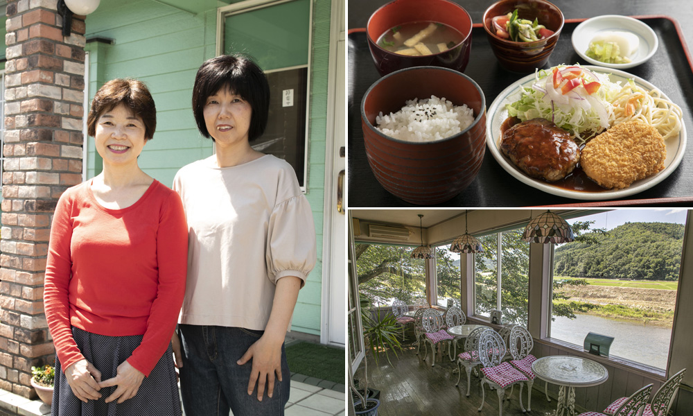 由良川水系の清流、土師川(はぜがわ)のほとり。ティファニーブルーの外壁の、可愛らしいペンションのような佇まいの『ポコァポコ』。ドアを開けると常連さんたちの賑やかな声と、窓に映る清々しい里山の風景が飛びこんでくる。「オープンから32年ほど経つけど、この景色に飽きたことはないのよ」と嬉しそうに話すのは、オーナーの半田さん。