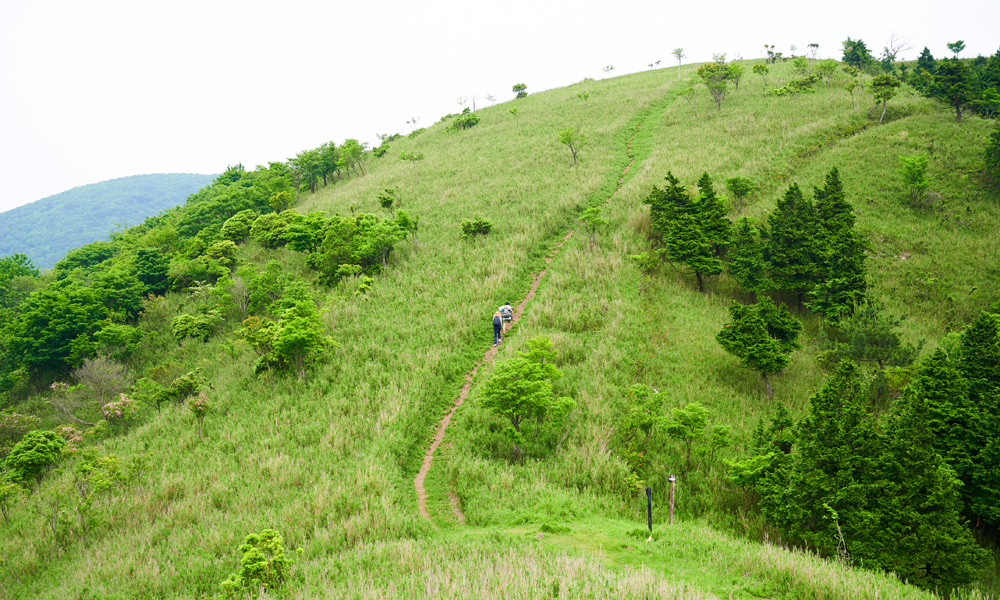 与謝野町加悦双峰公園~千丈ヶ嶽をピストンするルートです。道幅が広く、縦走路までの距離が短いため初心者におすすめのコースです。午前中に加悦双峰公園をスタートすれば、ちょうど昼食時に大江山連峰最高峰▲千丈ヶ嶽:832.4mに到着できます。畳千畳あると言われる名前の通り千丈ヶ嶽頂上は、山頂とは思えないだだっ広い原っぱで眺めもよく絶好の休憩所となります。スタートの加悦双峰公園にはキャンプ場も併設しておりHIKE&CAMPでがっつり大江山の大自然であそんでみるのもおすすめです。