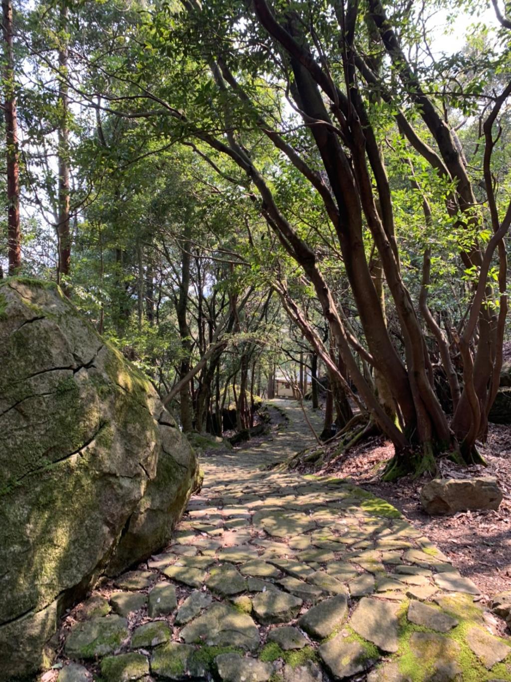 大江山には中世の交通遺跡である石畳の古道、「千年古道」が福知山市毛原から宮津市金山まで今現在も残っています。正式名:普甲道は、古代官道である山陰道の支線で、氷上郡から福知山、加悦谷を通り丹後府中(宮津市)に抜ける道の途中より分岐し、同じく丹後府中に至る道で、福知山から河守、内宮、毛原を抜けて辛皮から金山まで抜ける道です。後に開かれる仏性寺から中の茶屋、小田へ抜ける道(今普甲道、宮津街道)と分けて元普甲道と呼ばれることもあります。古代から中世にかけての普甲道の実態については、必ずしも明らかでありませんが、丹波から丹後国府へ至る経路としては最重要の道路であったと考えられています。