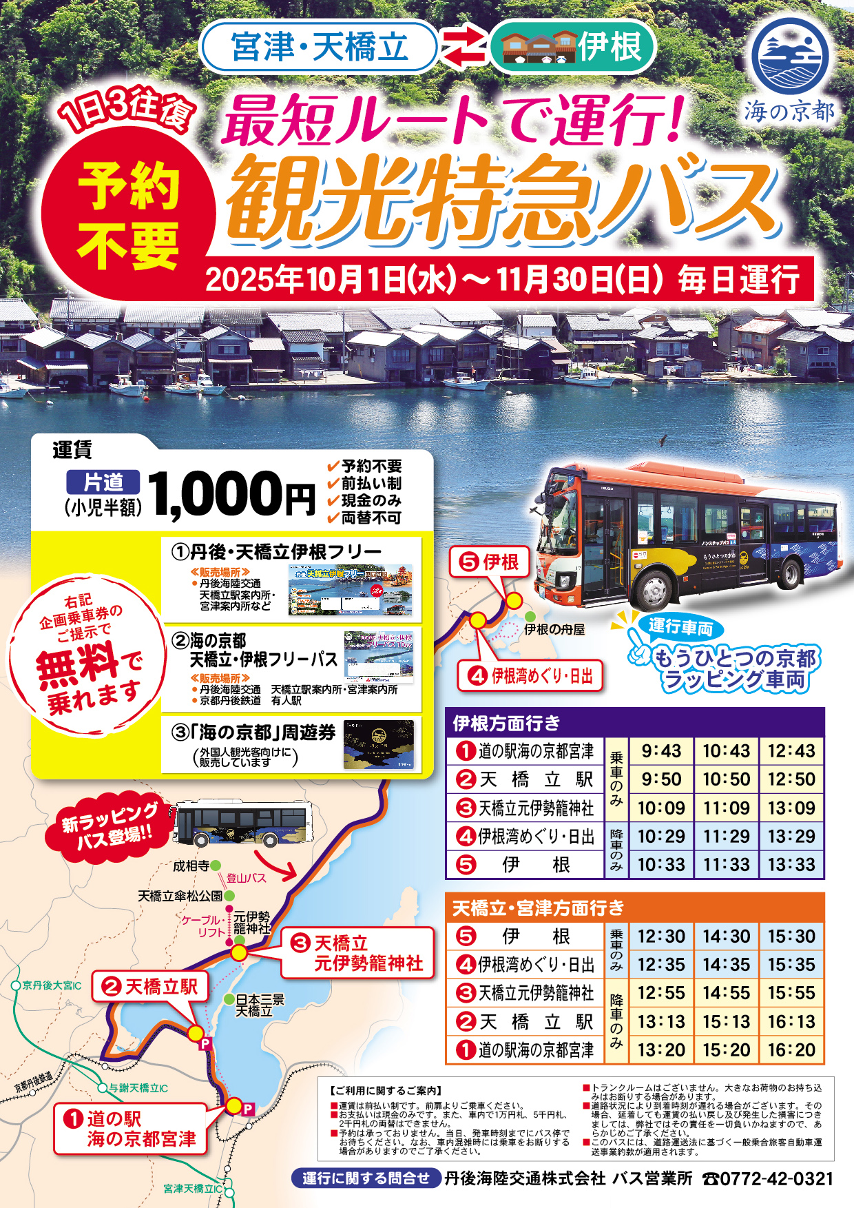 2025.09.29 観光特急バスの実証運行と伊根パーク&路線バスライドを開始します【オーバーツーリズム未然防止対策事業】 観光庁のオーバーツーリズム未然防止対策事業による支援を受け、観光特急バス(道の駅海の京都宮津-天橋立-元伊勢籠神社―伊根間)実証運行と伊根パーク&路線バスライドを下記のとおり開始します。 PRESSRELEASEF110_1.pdf (191.7 KB) PRESSRELEASEF110_2.jpg (1.5 MB) 一覧にもどる