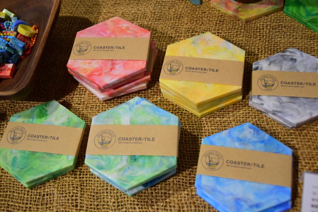 プラスチック再生は、海ごみやペットボトルキャップなどのプラスチックを活用してコースターなどの製品を作る。その工程は、プラスチックを細かく砕き、軟らかくなるように熱してから金型に流し込んで成形する。必要な装置は八隅さんが自作した。