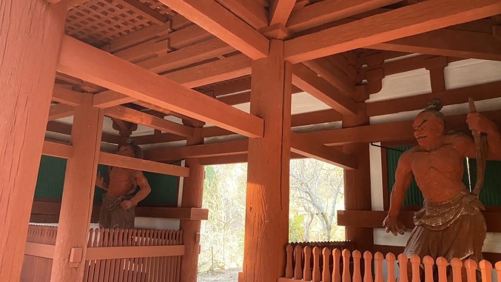 三間一戸、入母屋造の構造の二重門で、屋根は全国的にも珍しい栩葺。二王門は平成28年から修復工事が行われ、平成30年11月、約3年の時を経て、約750年前の姿を取り戻しました。