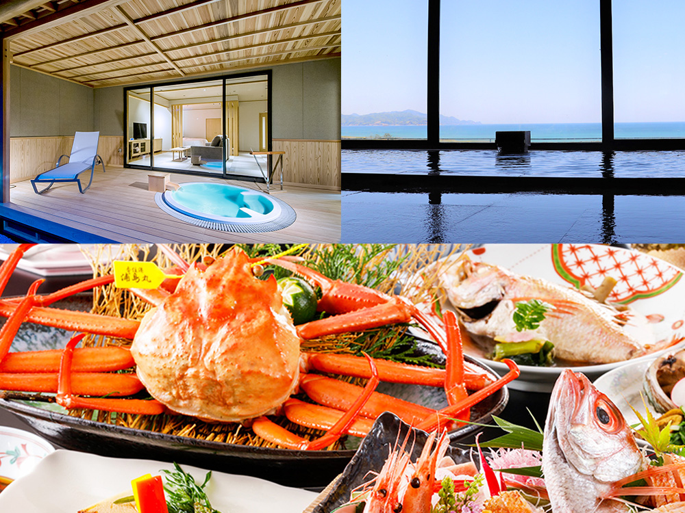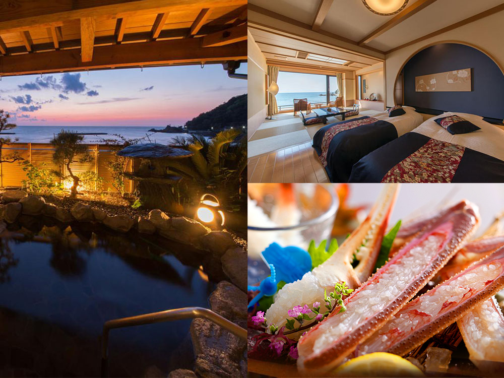 日本海を望む高台に佇む京都・丹後の大人だけの隠れ宿。源泉かけ流し露天風呂付客室に24時間入浴可能な大浴場。旬の魚介や但馬牛など丹後の味覚を一品出しのお部屋食でお愉しみ下さい。伊根の舟屋まで8分。