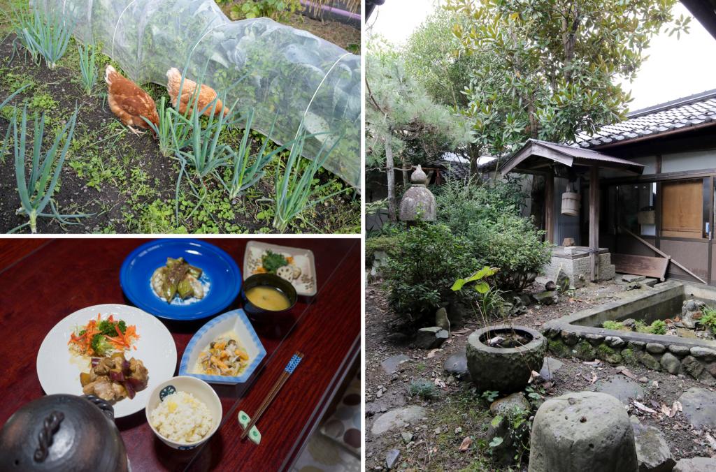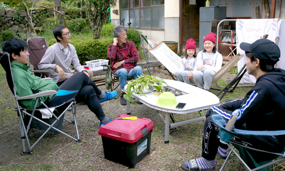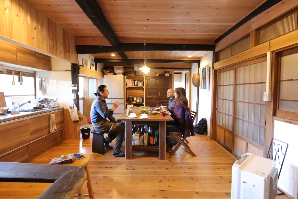 宿では一緒に料理を作ったり、ちゃぶ台を囲んで団らんしたり。オーナー家族も交え、泊まり客同士が一期一会のかけがえのない時間を過ごします。敷地内にある畑で一緒に収穫した野菜がそのまま食卓に上ることも。