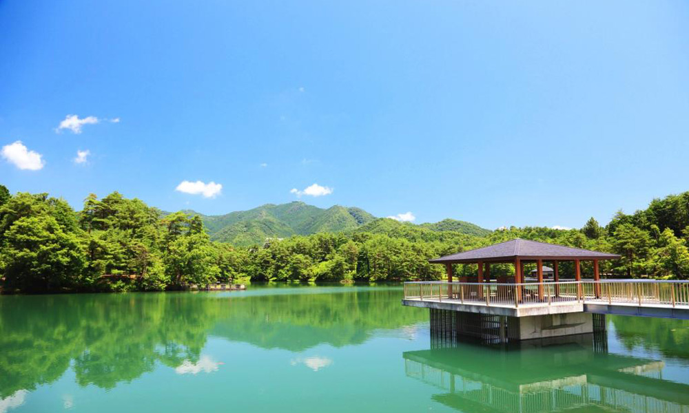 公園の中心にある池。満水時にはなんと、4.8haもの広さになる。 福知山藩主松平忠房により潅漑用の池として築かれたもので、池の周辺の松はとくに有名。1.3kmの散策道があるので、春はお花見、夏は水辺の野鳥をウォッチング、秋にはしっとり紅葉狩り、冬には雪見の散歩なんて楽しそう。 湖畔にある松風亭は数寄屋造りの茶室。お茶会や俳句の会で渋くきめよう。