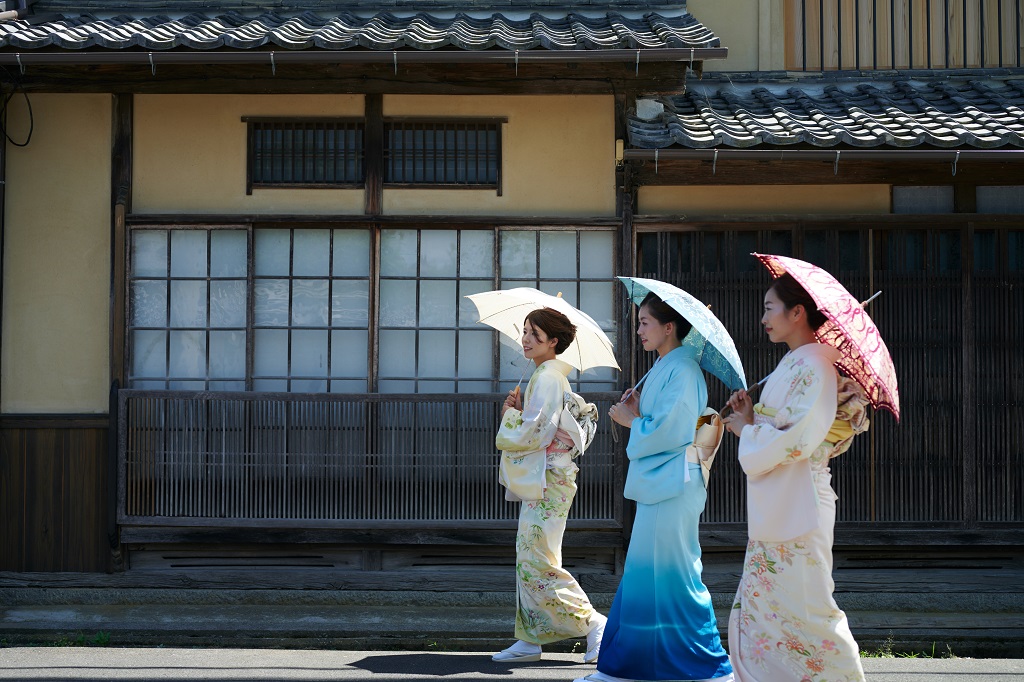 京都府北部エリア、丹後地方に位置するここ与謝野町は古くから高級着物の代名詞である「丹後ちりめん」の織物業を生業としてきた人々が暮らしています。 その織物業の物流拠点で栄えた「ちりめん街道」の町並みには、明治・大正・昭和の時代を経た商家が今に残ります。 とりわけ「旧尾藤家住宅」は旧家の格式さとモダンさを兼ね備え、当時の街の繁栄の面影を色濃く残しています。 この歴史文化の流れを感じる空間で、正絹の着物を身に纏う和装の所作をご体験され艶やかで贅沢な時間をお過ごしください。