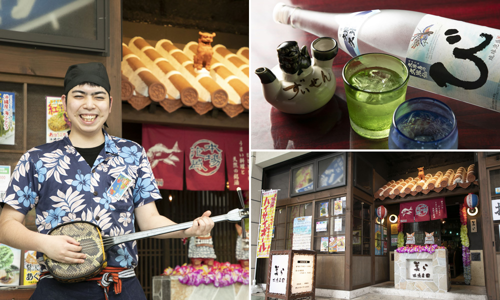 2008年にオープン、西舞鶴駅から徒歩圏内にある沖縄料理居酒屋。入り口には赤瓦の屋根やシーサー、店内には石垣や泡盛酒造所ののれんが飾られ、沖縄にいるかのように錯覚する。同じ海の街でありながら、非日常を体験できると、舞鶴のサラリーマンやカップル、家族連れで賑わっている。料理も現地を再現し、メニューに並ぶ沖縄名物は目移り必至。脂身まで甘くておいしいと評判の「あぐー豚」を使った鍋や鉄板焼は宴会利用には欠かせない看板料理だ。