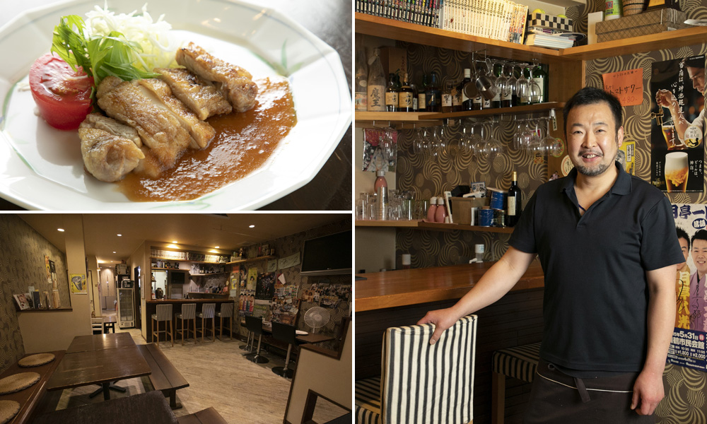 西舞鶴の中心にある商店街[サンモールマナイ]にあるダイニング。こぢんまりしたアットホームな雰囲気が魅力だ。腕を振るうのは、生まれも育ちもすぐ近くという友成竜治さん。人懐っこい性格が、みんなから親しまれている。揃える料理は、お酒にあうアテから、ごはんにあうおかずまで幅広い。店内に飾られた写真やアルバム仕立てのメニューブック、柱に残る背くらべからもわかるように、常連客は地元の老若男女。誰もが満足できるラインナップの理由だ。オリジナルカクテル青い「港舞鶴ハイボール」や、赤い「赤レンガハイボール」(各480)、「まいづる海自カレー」キャンペーンにも参加して、地元観光の盛り上げに、一役買っている。