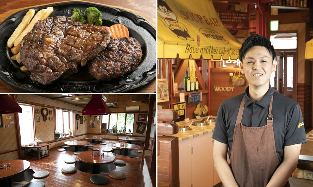 1984年に兵庫・豊岡で創業。3年後に福知山にも開店した、地元密着店。備長炭を使った本格的な炭火焼きのステーキと和牛ハンバーグが手軽に食べられるため、店内はいつも賑やか。花火を灯しながら運ばれてくるおこさまランチでスタートした子どもが、ウッディバーグ、ステーキ&ハンバーグのロースバーグ、さらには計420gのセット、ガリバーグと、成長とともにオーダーをボリュームアップしていくことが、福知山っ子の勲章になっている。