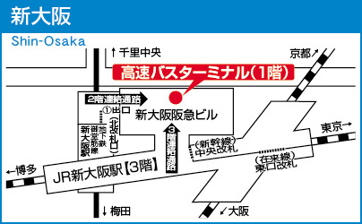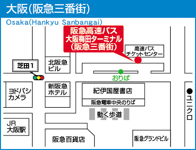 ・大阪(阪急三番街)~西宮北インターまでは乗車のみで、それ以降は降車のみです。